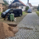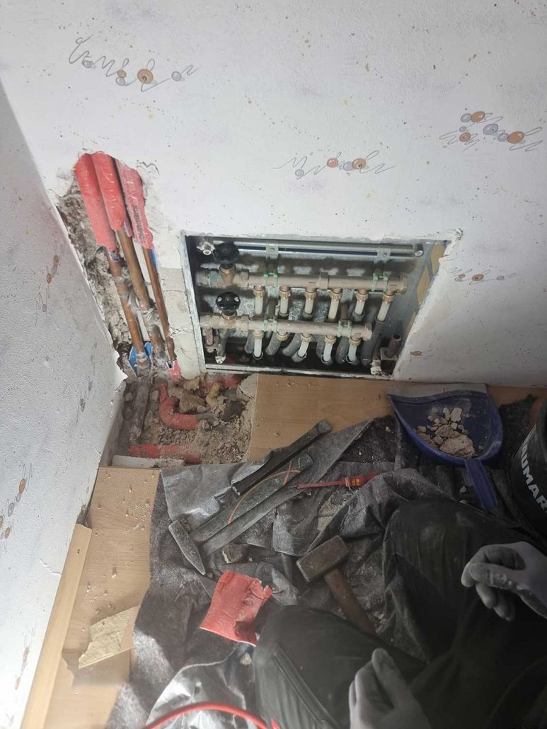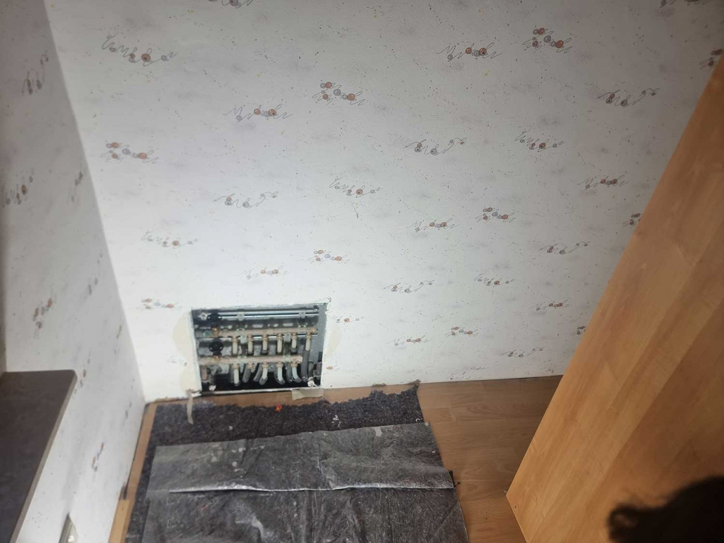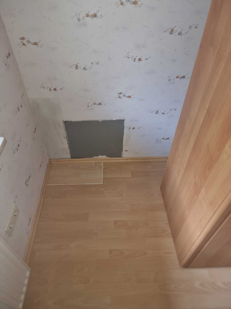 Da sich die defekte Leitung in der Decke zwischen Keller und Erdgeschoss befand, erfolgte die Reparatur im darüberliegenden Erdgeschosszimmer. Hier mussten sowohl Wand als auch Boden geöffnet werden, um die beschädigte Leitung freizulegen und fachgerecht zu ersetzen.